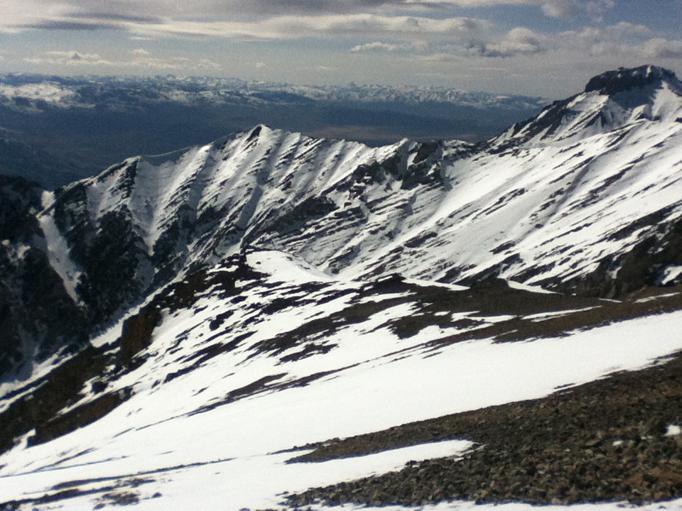 | Start of descent gully. All of Mackay is visible in the valley. With the wind picking up and clouds forming, I passed on the summit in favor of skiing fine velvet over boiler plate. |